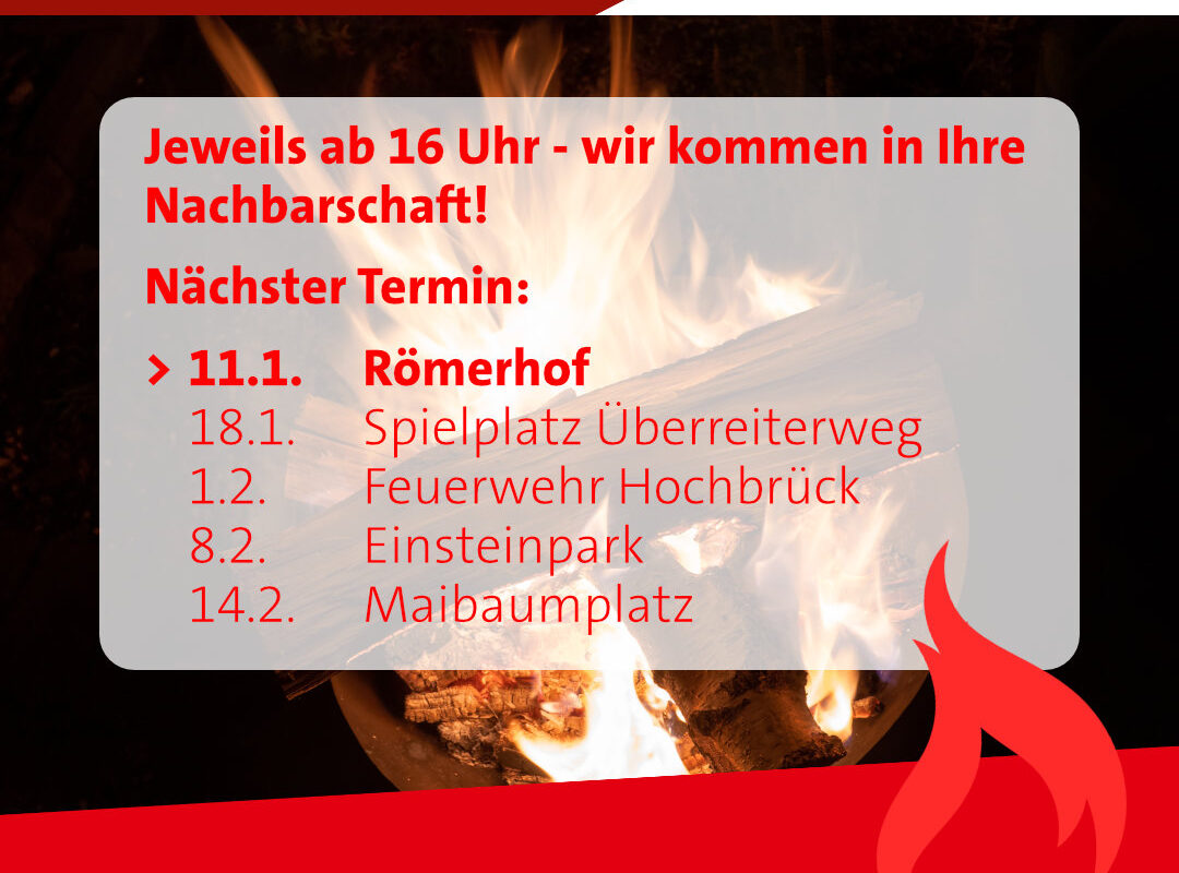 Wir laden Sie herzlich ein, in gemütlicher Atmosphäre Bürgermeister Dietmar Gruchmann und die Stadtrats-Kandidaten und -Kandidatinnen der SPD kennen zu lernen. Dazu kommen wir sonntagnachmittags ab 16 Uhr mit einer Feuerschale in Ihre Nachbarschaft: